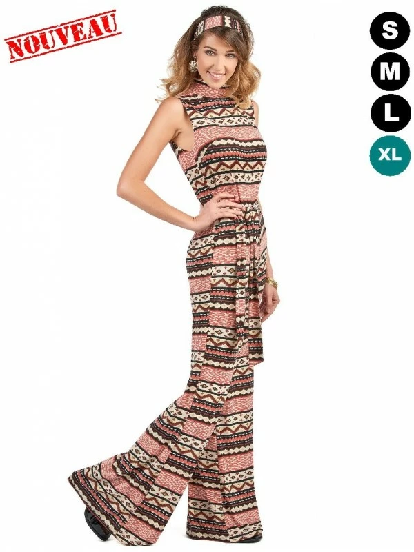 Entièrement imprimé de façon vintage, ce déguisement comprend la combinaison pattes deph ainsi que la ceinture. C’est la tenue pratique et idéale pour un thème placé sous les années 70, hippie ou ethnique.