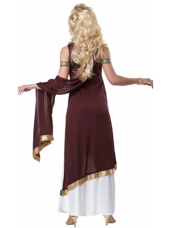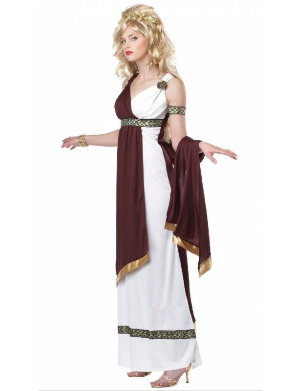 Cette magnifique tenue ici proposée en taille XL pour entrer dans la peau d’une impératrice de la Rome antique comprend la robe longue blanche sur laquelle la toge rouge est fixée à l’épaule grâce à deux médaillons. La ceinture est présente pour ajuster le déguisement à votre morphologie. Vous constatez que des motifs de la Rome antique sont imprimés sur un liseré dans le bas de la robe et sur la ceinture qui est assortie aux deux tours de bras.