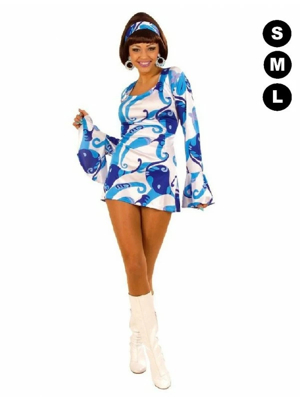 Ce déguisement pour femme comprend la robe légèrement satinée à motifs rappelant absolument l’univers des années 70… Vous pourrez également nouer le bandeau soit pour attacher vos cheveux longs, soit autour de votre cou…