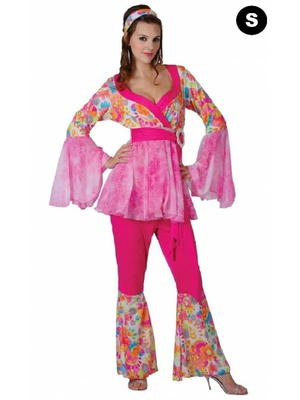Nous vous proposons ce déguisement rose pour femme qui comprend le pantalon rose avec de larges pattes d’éléphant « fleuries », la tunique avec ceinture le tout assortie au pantalon. Les manches très « trompettes » donnent à cette tenue un effet glam et élégant… Vous terminerez de vous préparer en nouant le bandeau autour de votre tête….