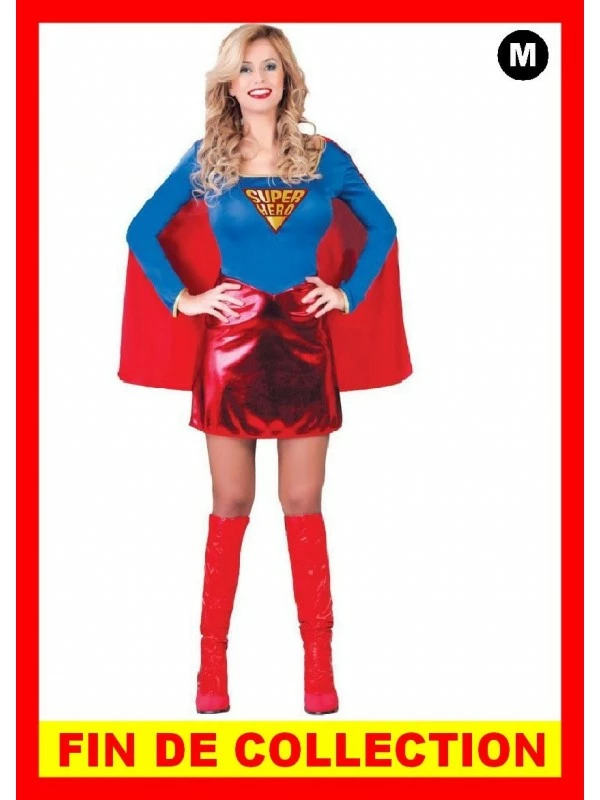 Nous vous proposons ici une tenue de super héroïne qui passera pour entrer dans la peau de Supergirl, Wonder Woman. Ce déguisement comprend donc la robe manches longues alors que la partie jupe est rouge lamé. Comme pour tous les supers héros, vous disposerez également de la cape rouge.